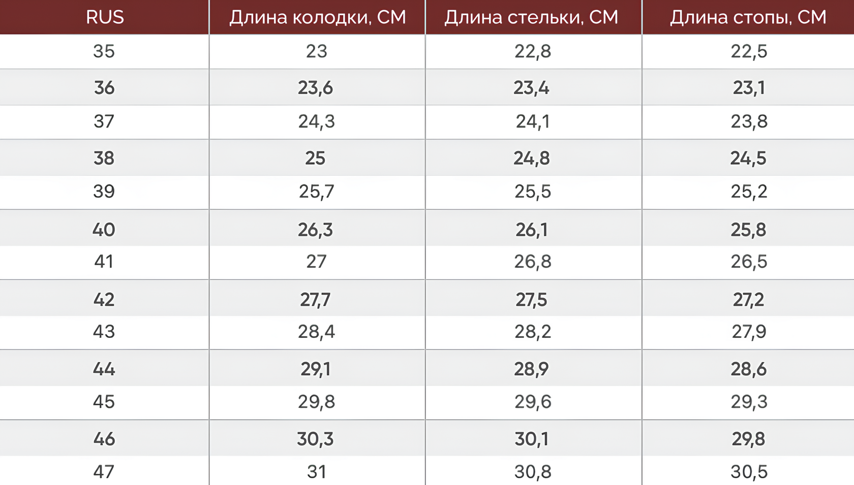 Длина обуви по стельке (внутреннего пространства обуви) должна быть примерно на 5-8 мм больше длины стопы, припуск до 5 мм можно, но только для мягкой обуви (например, мокасин или топсайдеров). Иначе, при каждом шаге пальцы будут испытывать ударную нагрузку от столкновения с носком.